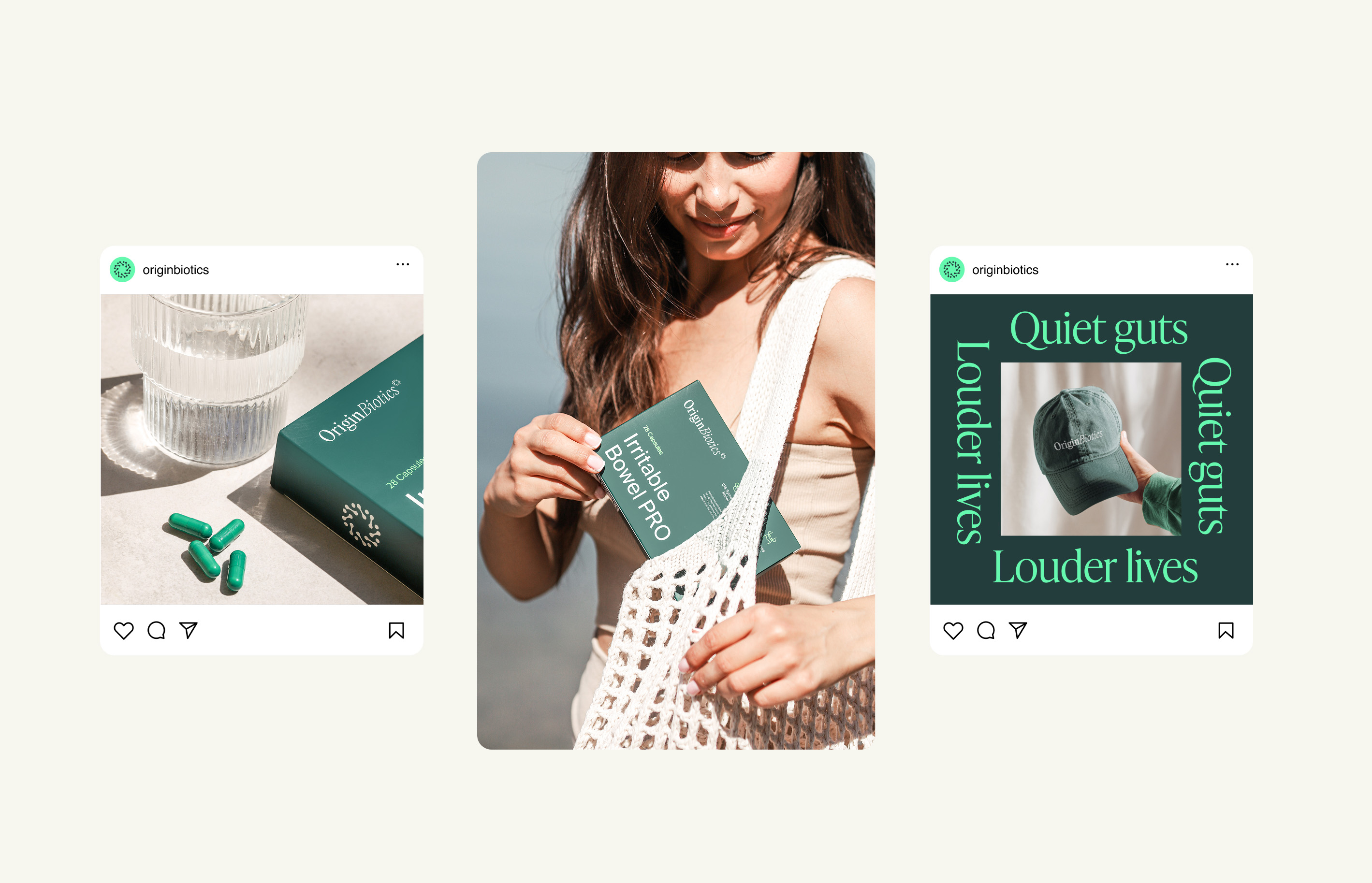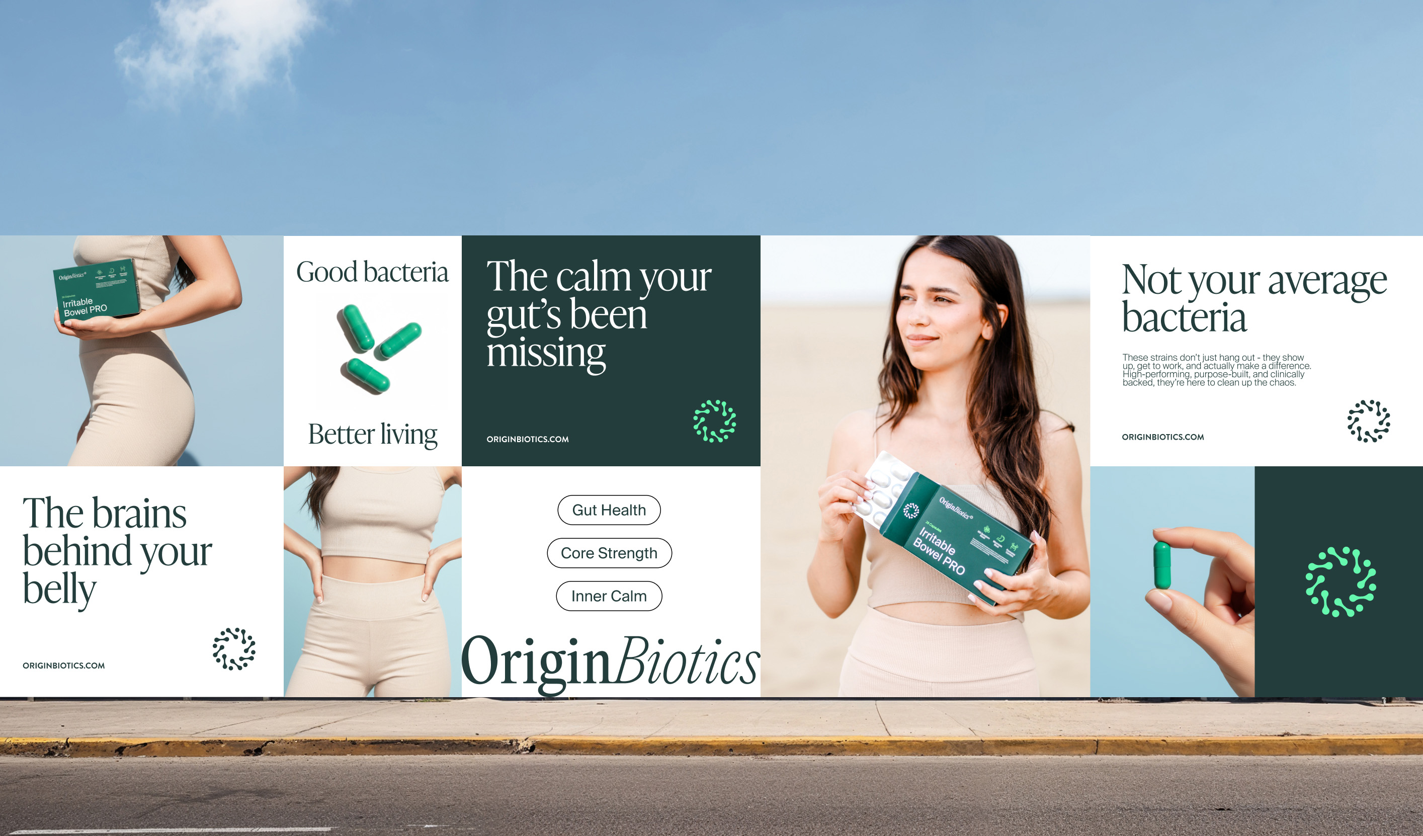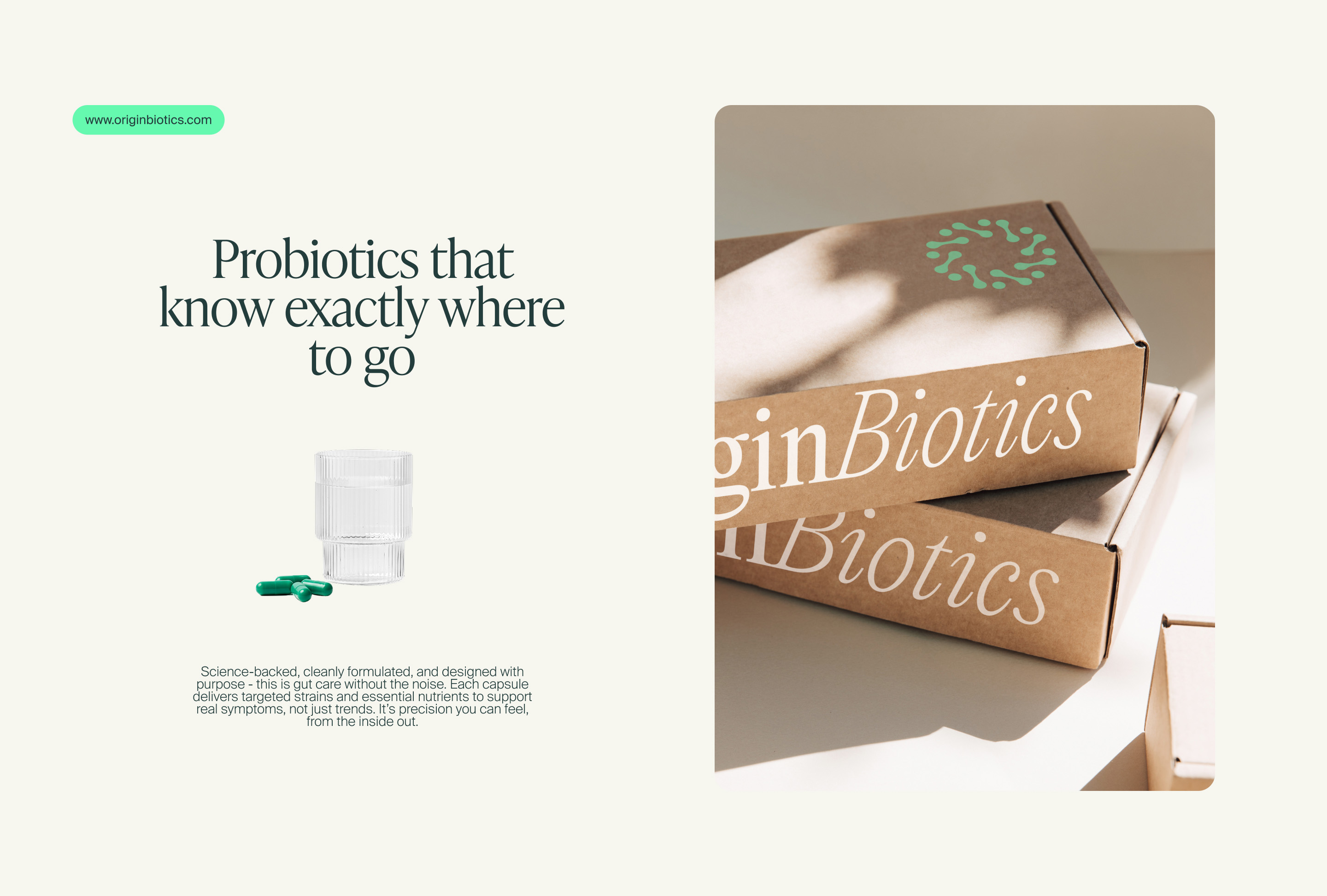 Origin Biotics is a probiotic supplement brand built around precision, calm, and clarity. We developed the visual identity and packaging to reflect the brand’s scientific roots while keeping things clean and accessible. A deep green palette anchors the design, supported by minimal typography and straightforward iconography that communicates real benefits without the noise. The layout is clinical but soft, modern but restrained - designed to feel reliable on a shelf or in a scroll. Everything is built to support the product’s core promise: targeted strains for everyday balance.
